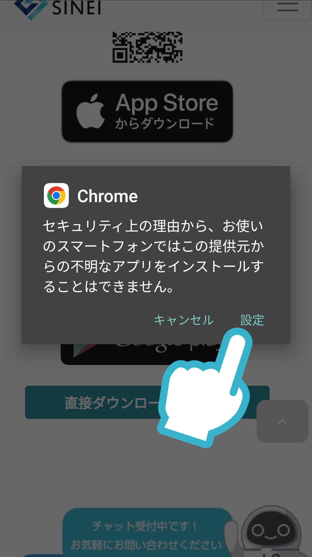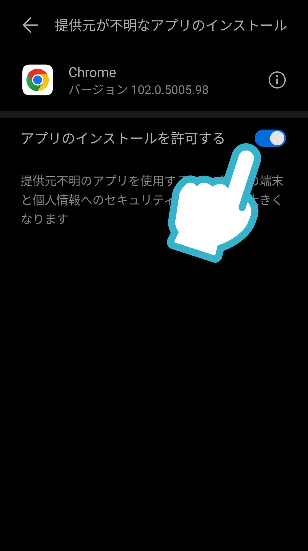 警告が表示されましたら、設定からアプリのインストールを許可するよう設定の変更をお願いいたします。